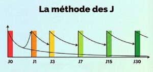 La méthode impose un planning rigoureux, il faut savoir être assidu. Par exemple, la méthode des « J » la plus réputée et efficace pour sécuriser une notion jusqu’au jour de l’examen reste celle-ci : J0 ; J1 ; J3 ; J7 ; J15. J30.