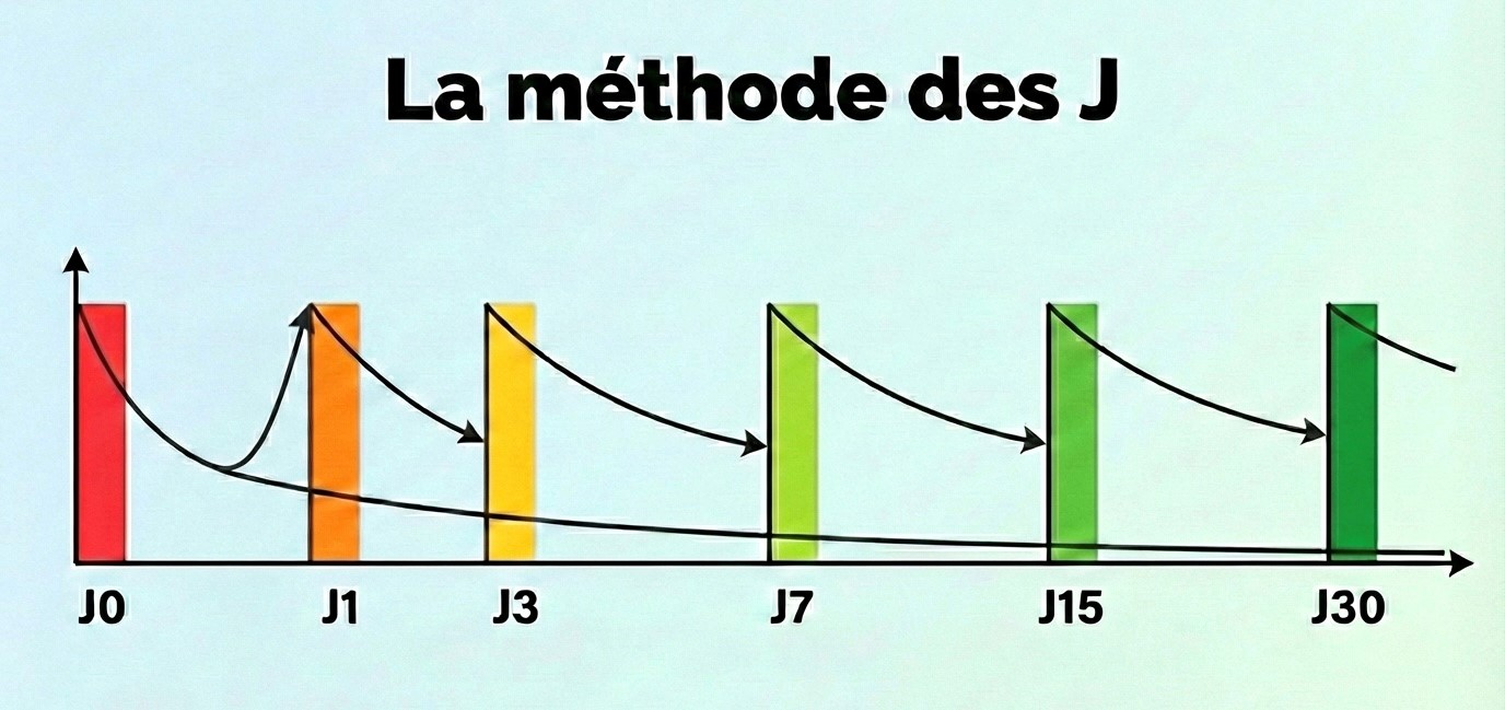 - J3 (le surlendemain) : Premier rappel espacé. Une lecture rapide suffit souvent.